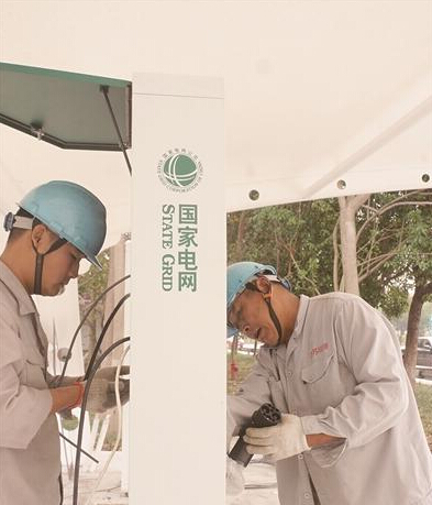 圖為江蘇送變電工作人員正在車(chē)棚下安裝充電樁