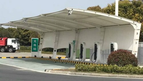 高速服務(wù)區(qū)充電站膜結(jié)構(gòu)車棚,依賴于新型膜材料的性能優(yōu)點(diǎn),充電站車棚采用膜結(jié)構(gòu)形式來建造將得到大力推廣。