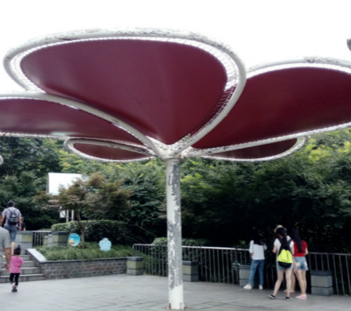 園區(qū)內(nèi)的膜結(jié)構(gòu)涼亭,似一把大傘給駐足休息的人們遮陽擋雨。