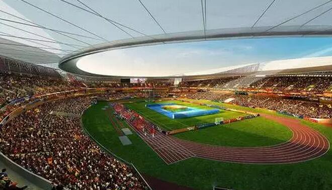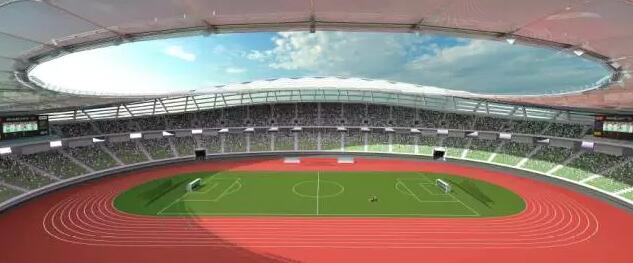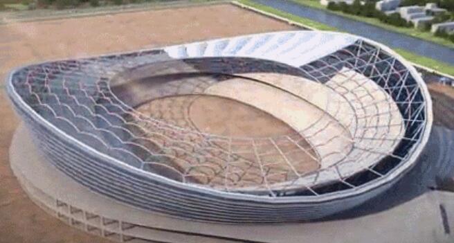 目前國內(nèi)采用單層索網(wǎng)結(jié)構(gòu)的場館跨度為100米左右,而園區(qū)體育中心體育場跨度達(dá)到了260米,為國內(nèi)最大跨度的單層索網(wǎng)結(jié)構(gòu)。該結(jié)構(gòu)為中間開孔的單層索網(wǎng)體系,設(shè)計思路來源于預(yù)張拉鋼條的自行車車輪,主要包括結(jié)構(gòu)柱、外壓環(huán)、徑向索以及內(nèi)環(huán)索,整個輪輻式索網(wǎng)屋蓋支撐在外圈傾斜的V型鋼柱上,形成了一個優(yōu)美的馬鞍型。體育場索網(wǎng)由40榀徑向索和內(nèi)側(cè)8根受拉環(huán)向索組成,全部索體均采用高標(biāo)準(zhǔn)的進(jìn)口密閉鎖,在索網(wǎng)體系上安裝鋼拱并覆蓋張拉PTFE膜材形成膜屋面,膜屋面投影總面積約為31900平方米,最大膜單元面積為1200平方米。