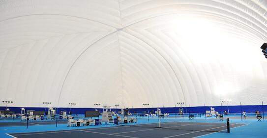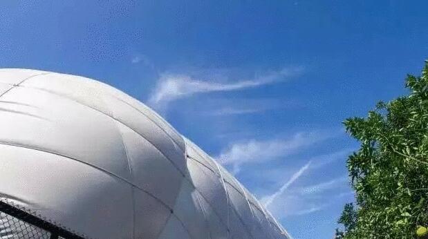 這座新落成的網(wǎng)球館最大的特點,就是其外圍撐開來的這一層白色氣膜。據(jù)了解,這層氣膜的厚度大約為1至2米,內(nèi)外是特殊的PVC材料,中間填充氣體。整個結(jié)構(gòu)沒有利用任何的鋼筋水泥做支撐,單純依靠氣膜,打造出了一個長78米寬76米高25米的密閉空間。