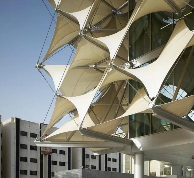 立面的外表皮是由長菱形的織物材料組成,這些白色薄膜通過立體的帶拉伸力的鋼絲繩結(jié)構(gòu)支撐起來,即張拉膜結(jié)構(gòu),不但具有遮陽的功能,而且用一種新的現(xiàn)代科技的方式重新詮釋了阿拉伯帳篷結(jié)構(gòu)的傳統(tǒng)。這個(gè)古代文化與現(xiàn)代技術(shù)交相融合后產(chǎn)生的獨(dú)特造型,形成了一個(gè)渾然一體的且有威望感的建筑外觀。夜晚,建筑物的立面會(huì)閃爍出不斷變化著的不同顏色的光,成為這個(gè)城市的一座文化燈塔。