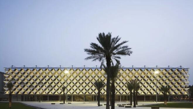 這個(gè)標(biāo)志性的新的立方體結(jié)構(gòu)包裹了舊圖書館大樓,在利雅得的城市風(fēng)貌中展現(xiàn)出一個(gè)新的建筑形象。舊樓被保護(hù)與傳承,變成了新樓內(nèi)部的知識(shí)中心,新舊建筑和諧地融為一體。新樓的金銀細(xì)絲織物的立面繼承了中東地區(qū)建筑圖案的傳統(tǒng),并與現(xiàn)代化的藝術(shù)科技聯(lián)系起來。設(shè)計(jì)產(chǎn)生的本源要追溯到2003年的國際競(jìng)標(biāo)賽。