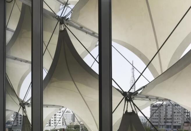 在這些金銀色絲織物的鋼絲繩結(jié)構(gòu)中,雖然太陽能的普及水平只有百分之七,但也保證了建筑物的內(nèi)外視線通透。在室外溫度超過50攝氏度的情況下,這個(gè)薄膜層通過立體的布局,將最優(yōu)化的折射光照入室內(nèi),保持了室內(nèi)舒適的溫度和光照環(huán)境。