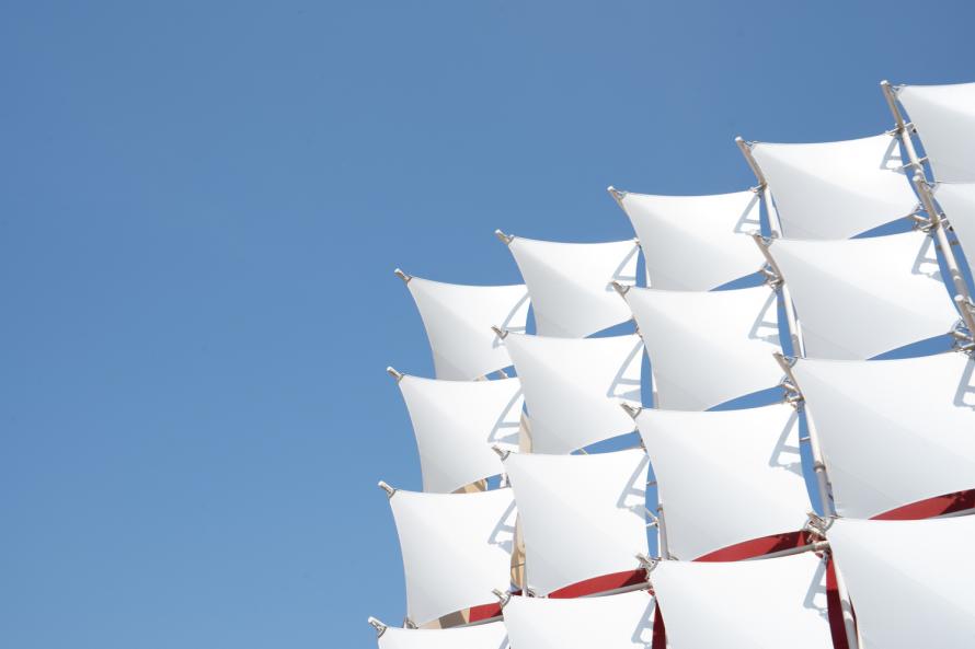 在二期項(xiàng)目中,通過用膜結(jié)構(gòu)覆蓋現(xiàn)有建筑形成的不規(guī)則體量結(jié)構(gòu)的三面,簡(jiǎn)化其在公園內(nèi)的形象。同時(shí),通過采用參數(shù)化設(shè)計(jì)和引入自然紋理的動(dòng)感,膜結(jié)構(gòu)的設(shè)計(jì)被賦予了同質(zhì)化的動(dòng)態(tài)形象,提供一個(gè)同質(zhì)的動(dòng)態(tài)圖像。