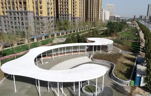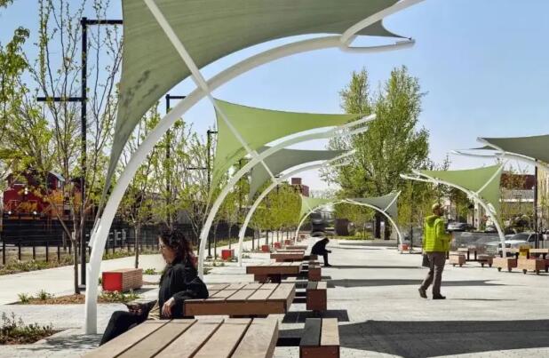 在已建成的口袋公園中,張拉膜結構設施的身影屢屢出現(xiàn),正是因為張拉膜的特性使之受到眾多設計者們的垂青,它體量可大可小,設計感強,可作為遮陽遮雨,非機動車棚,入口標識等設施存在,也能作為景觀小品存在。張拉膜還可選用彩色膜材來打造,與口袋公園活潑明快的設計理念一致,若配上燈光裝置,夜晚更是溫馨。