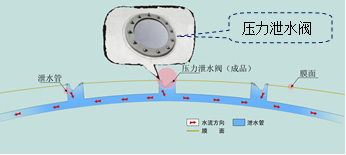 在膜頂部較為平坦區(qū)域設(shè)置壓力泄水閥,膜頂部積水深度與膜內(nèi)氣壓形成聯(lián)動(dòng)關(guān)系,在積水超過(guò)一定量時(shí),水壓力大于膜內(nèi)氣壓,壓力泄水閥門(mén)會(huì)自動(dòng)打開(kāi),水流匯集到內(nèi)部排水軟管導(dǎo)出。泄水閥間距建議不超過(guò)