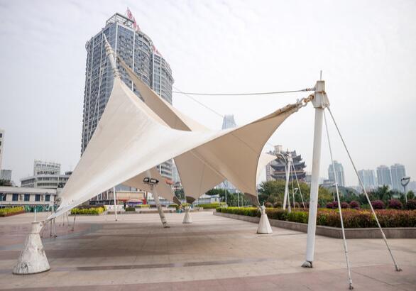 膜結(jié)構(gòu)主要由膜材、鋼索及支柱組成,通過鋼索的抻拉作用使膜材形成張力,以達到固定的結(jié)構(gòu)形式。它以各種自由、輕巧、柔美,充滿力量感的造型,成為園林或景觀裝置的重要組成部分之一。