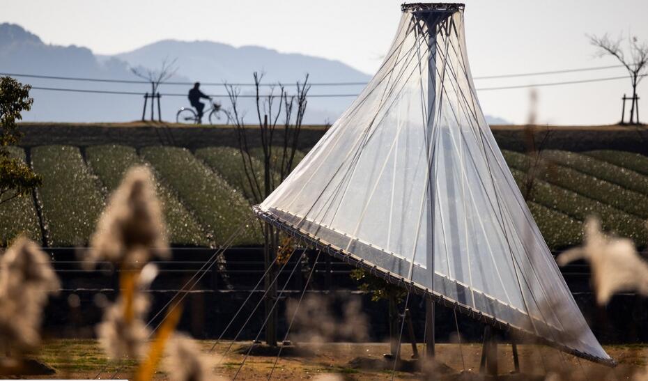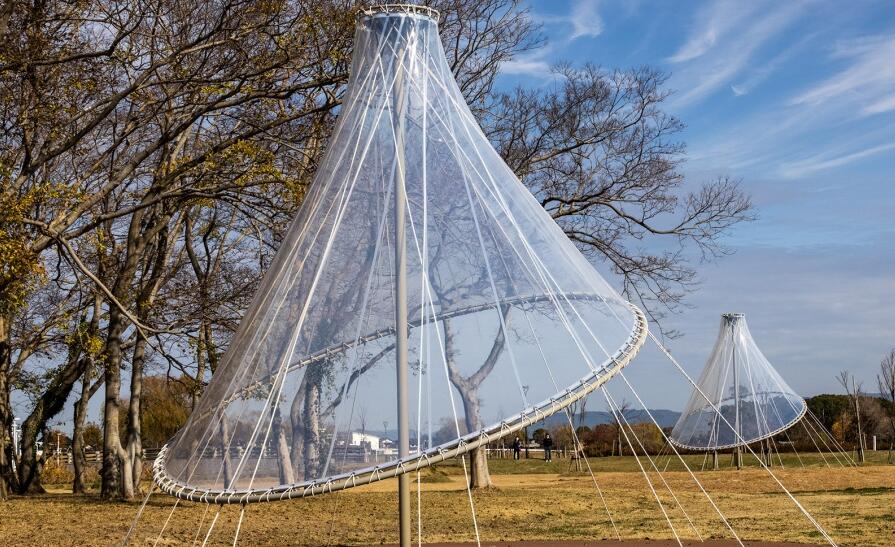 筑后廣域公園位于矢部川旁,是福岡縣面積最大的公園。隈研吾事務(wù)所在這座公園內(nèi)設(shè)計(jì)了一組輕盈透明的膜結(jié)構(gòu)裝置。
