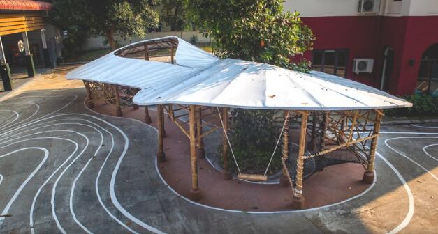 整個結(jié)構(gòu)由竹子和膜布建成,龍竹(Dendrocalamus giganteus )用于框架,銳藥竹(Oxytenanthera albocialiata Munro)用于弧形元素,而支撐和屋頂梁則采用泰竹(Thysostachys siamensis ), 屋頂覆蓋白色膜布,在∞形狀的兩個開口內(nèi)是場地的既有樹木和座位空間,供教師休息的同時能夠隨時視察孩子們的情況。
