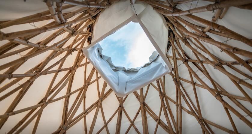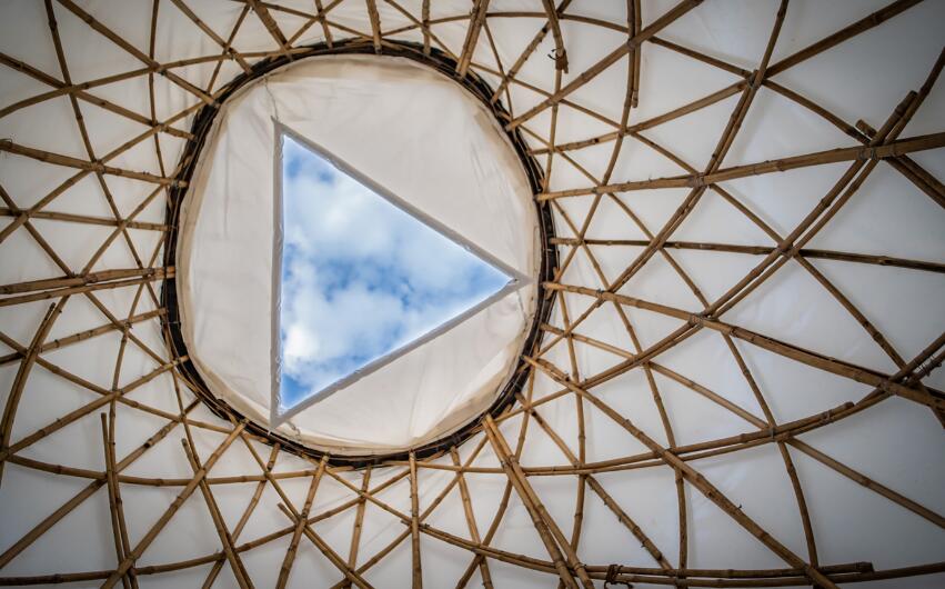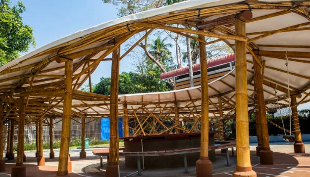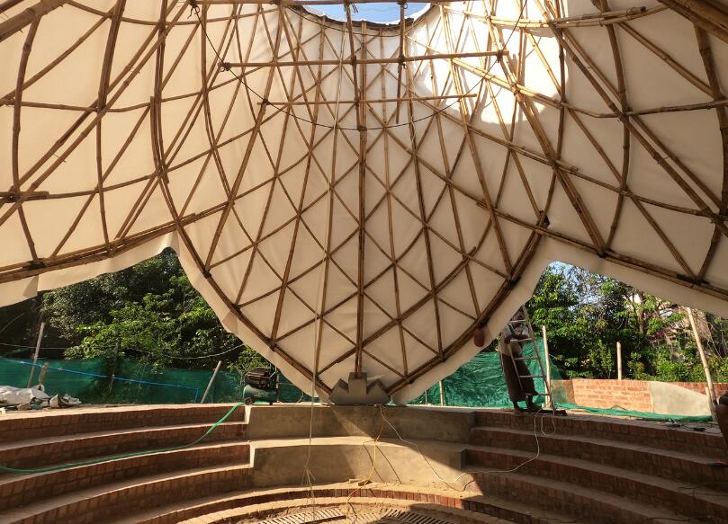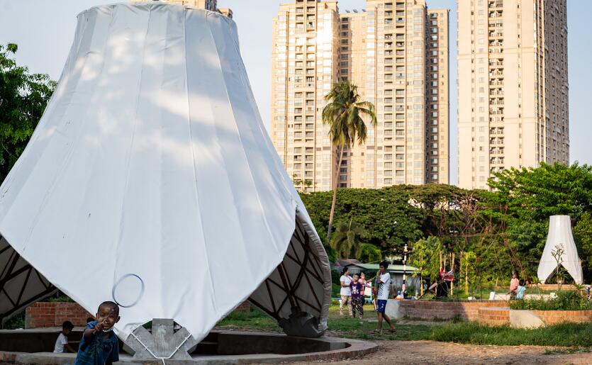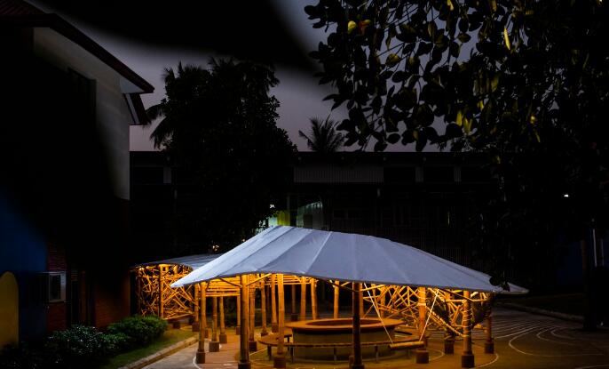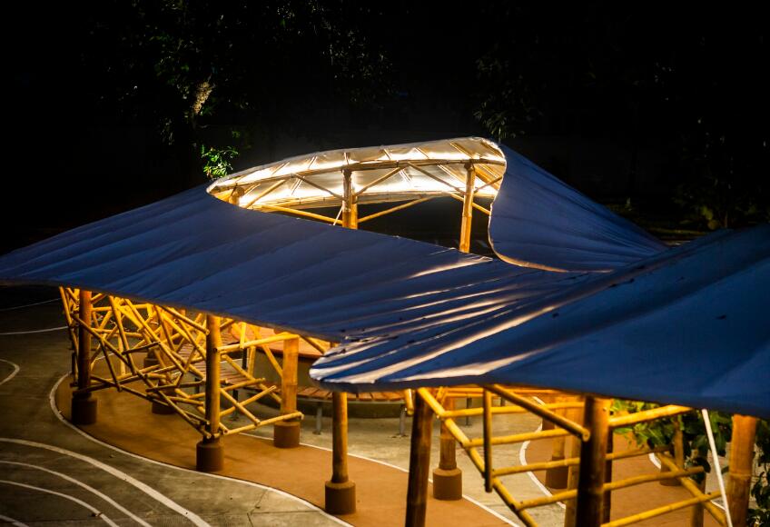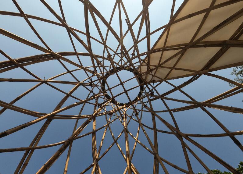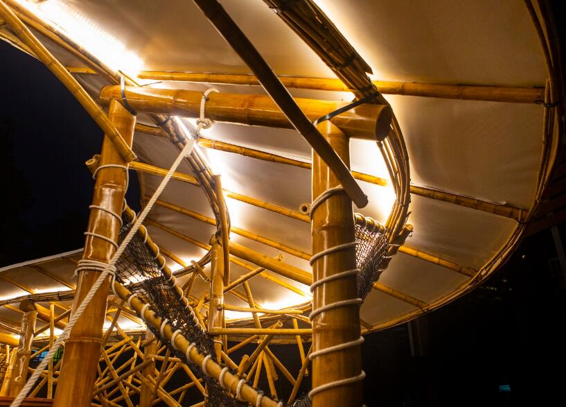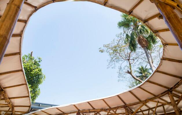 這個項目位于城市中心,并被實際建造出來,其目標是向世界展示竹子作為一種碳足跡極低的生態(tài)材料在建筑業(yè)中的可能性。利用現(xiàn)代的竹子處理技術(shù)來建造大型的持久結(jié)構(gòu),此外,外圍護采用目前流行的新材料膜材來實現(xiàn),更凸顯其環(huán)保安全性能。