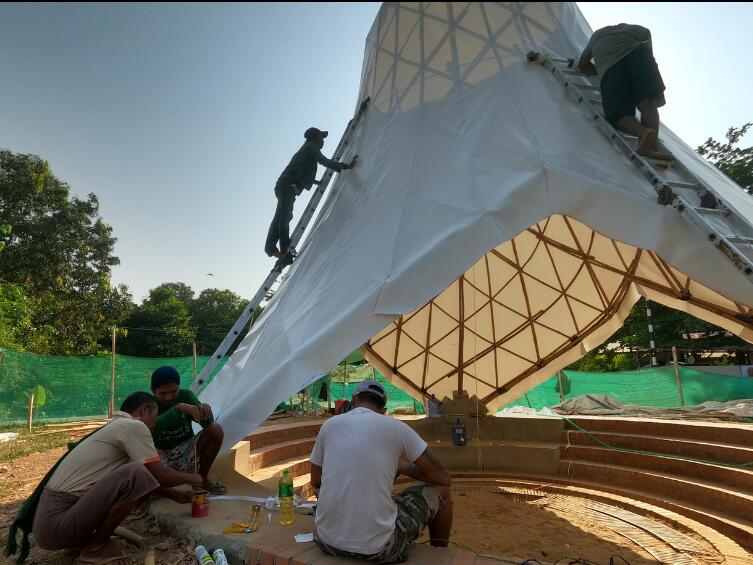 該項目旨在將一塊0.4英畝的荒地改造成社區(qū)的公共休閑空間。其中包括一個獨立的下巴球場(緬甸傳統(tǒng)球類運動)、一個 zayat (老人休息區(qū))、一個城市社區(qū)農(nóng)場和一個多功能運動場,該運動場還可以作為文化和社區(qū)活動的場地。設(shè)計靈感來自緬甸傳統(tǒng)的竹腳手架施工技術(shù)。這種國家級非物質(zhì)文化遺產(chǎn)正在慢慢消失,并被金屬結(jié)構(gòu)所取代。
