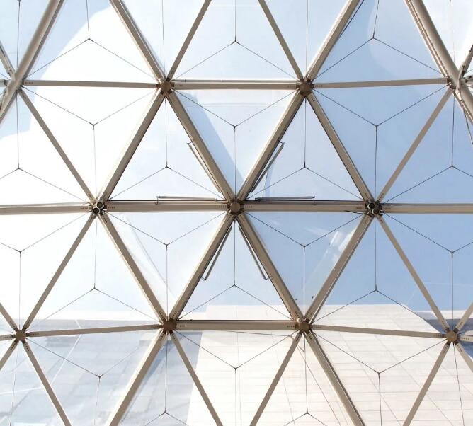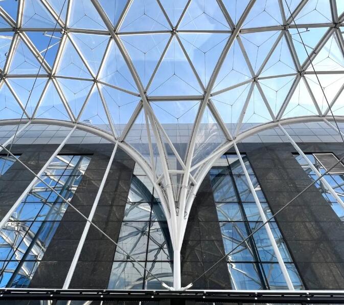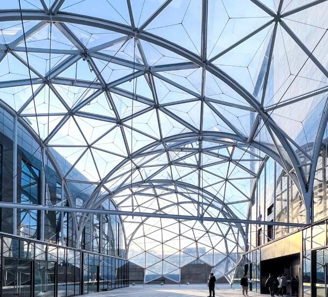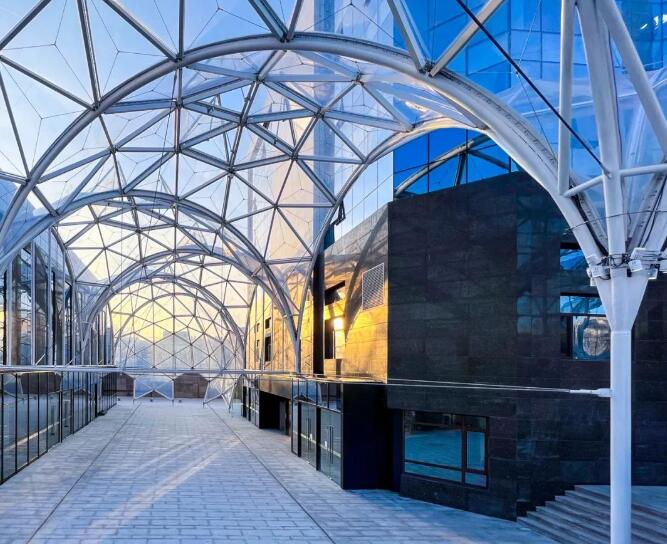 該建筑采用ETFE張拉膜結(jié)構(gòu),可以利用膜材的輕質(zhì)柔韌性,輕松打造預(yù)設(shè)的造型,在矩形高樓之間顯得美觀獨(dú)特。透明的ETFE膜結(jié)構(gòu)頂棚,不僅能遮蔽風(fēng)雨,利用其透光性還能植入綠植,為沉悶的廠區(qū)營造了輕盈、綠色的空間環(huán)境。