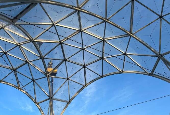 不同于以往多采用氣枕的ETFE建筑,本項目采用的是單層ETFE,由于沒使用氣枕結(jié)構(gòu),單層的膜更顯著通透,再加上結(jié)構(gòu)纖細(xì)的截面,整體給人的感覺就輕透。但由于材料強(qiáng)度的限制,所以在膜面內(nèi)置了加強(qiáng)膜強(qiáng)度的膜層索。也正是由于膜層索的布置,材料焊縫又恰到好處的隱藏到了索套位置。所以抬頭看,幾乎感覺不到焊縫的存在。也算是工、技、術(shù)、藝的完美結(jié)合。