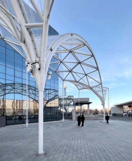 位于北京大興的科興天富疫苗廠區(qū)由工業(yè)廠房改造而來,員工從車間到食堂用餐,缺少風(fēng)雨遮蔽和戶外休憩的場所,為此設(shè)計師選擇了ETFE張拉膜結(jié)構(gòu)形式來建造。