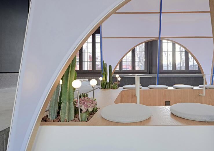 帳篷的最大特色在于其通透的弧線邊界,在視覺上具有獨(dú)特的視覺魅力,身處其中有一種置身戶外的松弛感。