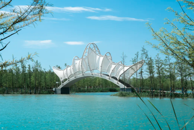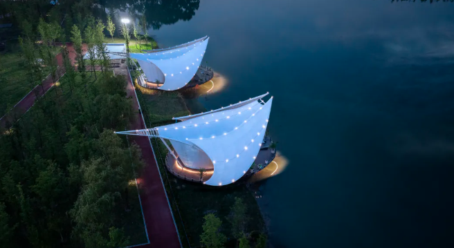 在圩美磨灘萌鳥營地中設(shè)計師善于運(yùn)用輕盈膜結(jié)構(gòu)來詮釋“童心”,客房、辦公區(qū)、橋等場所都能看到膜結(jié)構(gòu)元素,透光通風(fēng)的膜結(jié)構(gòu)材質(zhì)捕捉著大自然的光線與微風(fēng),營造出溫馨而自然的氛圍。