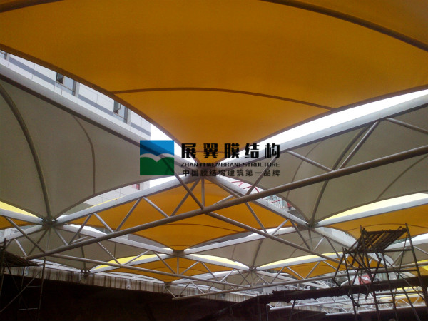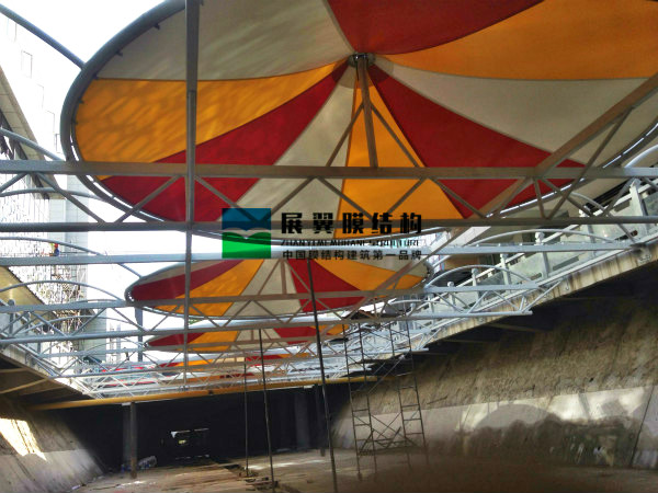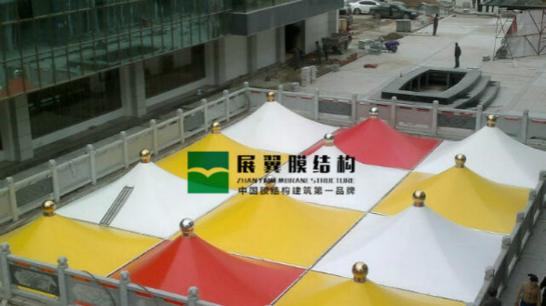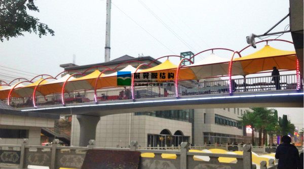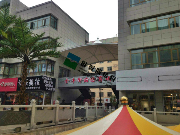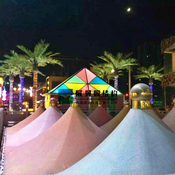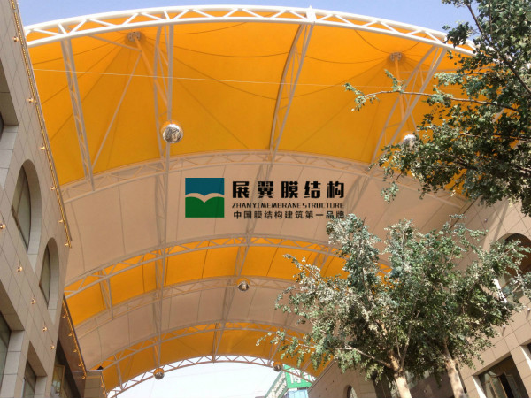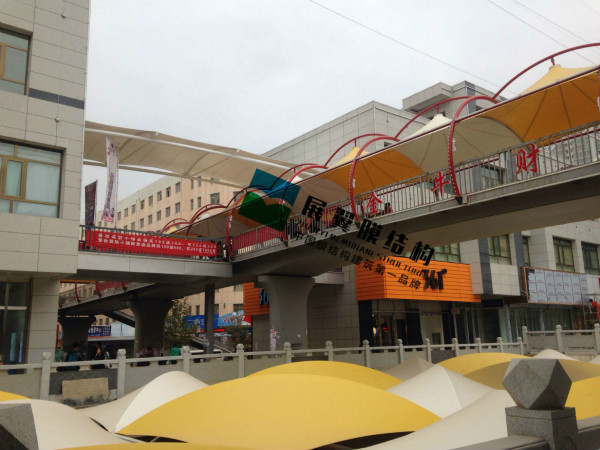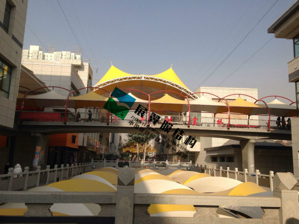 蘭州金牛街膜結(jié)構(gòu)工程全系列包括膜結(jié)構(gòu)天井、膜結(jié)構(gòu)屋頂遮陽棚、膜結(jié)構(gòu)天橋通道遮陽棚、啤酒屋膜結(jié)構(gòu)屋頂、特殊膜材玻璃房等等、工程全部采用彩色膜材搭配建造,造型設(shè)計(jì)別出心裁。這些張拉膜建筑不但具備強(qiáng)大的實(shí)用功能,同時(shí)也成為了商業(yè)街一大觀賞亮點(diǎn)。