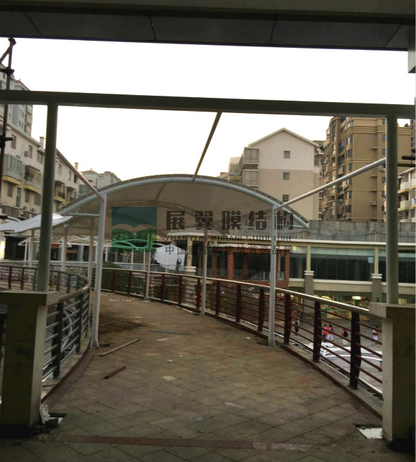 江西贛州萬盛廣場室外1-5號電梯張拉膜雨棚均已安裝完成,而廣場天橋通道同樣采用張拉膜來建造,近日該通道膜結構正在施工當中,膜材覆蓋安裝工作已過半,不日將正式完工。下面為工程圖片: