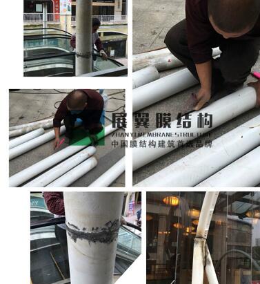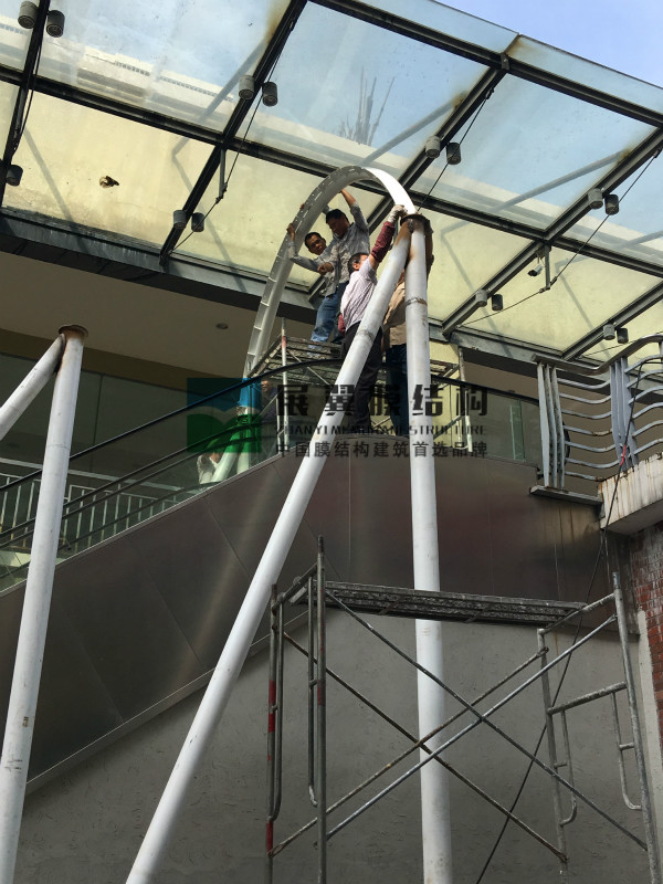 江西贛州萬盛廣場電梯膜結(jié)構(gòu)雨棚工程近日正在施工,鋼結(jié)構(gòu)加工完畢后進(jìn)入安裝工序,之后將是膜材的覆蓋工作,下面是現(xiàn)場施工圖: