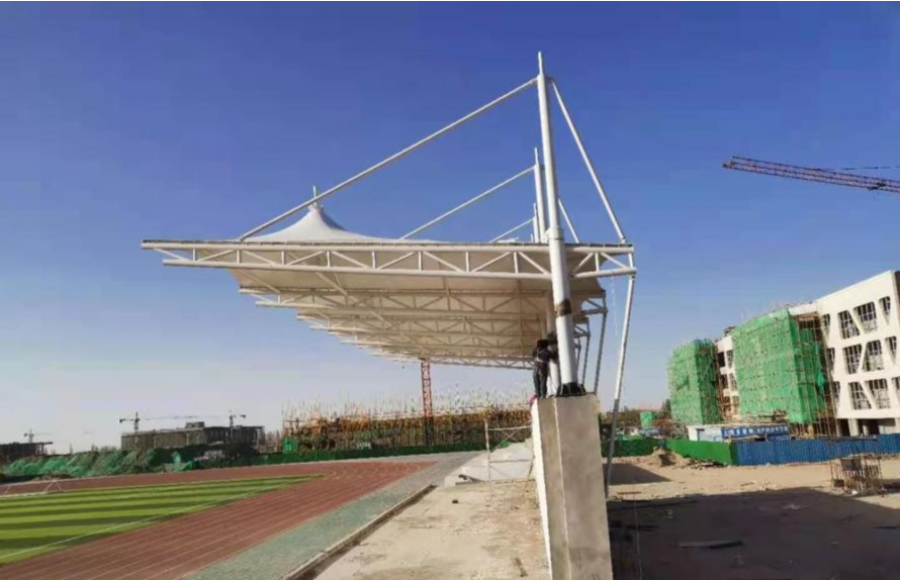 新疆哈密張拉膜結(jié)構(gòu)看臺(tái)工程近日完工,看臺(tái)設(shè)計(jì)為單邊懸挑尖頂造型,經(jīng)典大方,實(shí)用美觀。