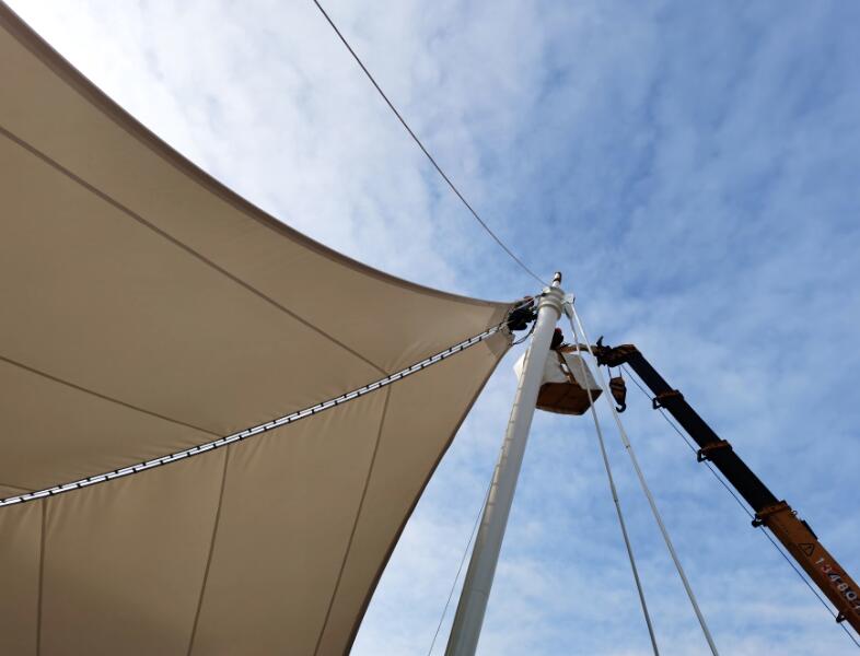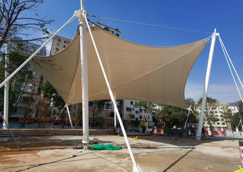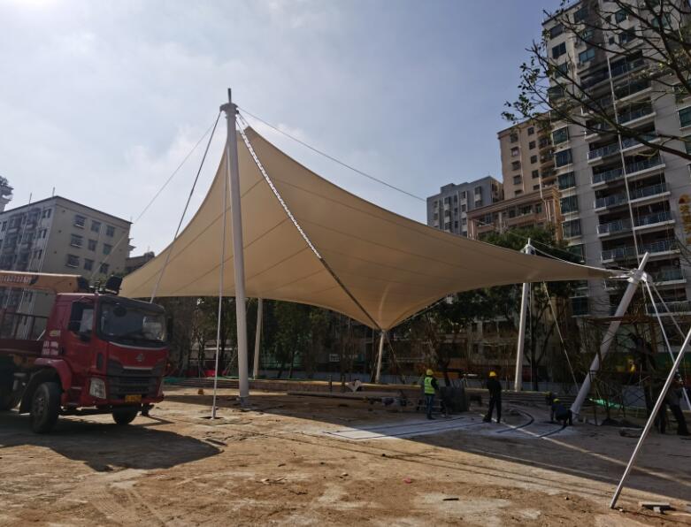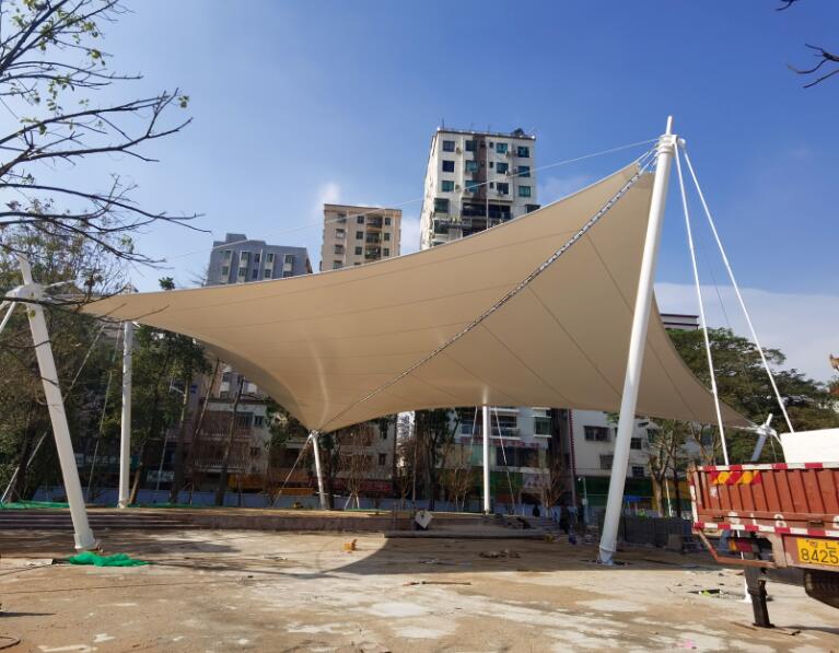 深圳寶安區(qū)廣場(chǎng)景觀膜結(jié)構(gòu)遮陽(yáng)棚工程完工,該遮陽(yáng)棚設(shè)計(jì)為經(jīng)典飛燕造型,整片張拉,簡(jiǎn)潔大方,美觀兼實(shí)用,是居民休憩好去處。
