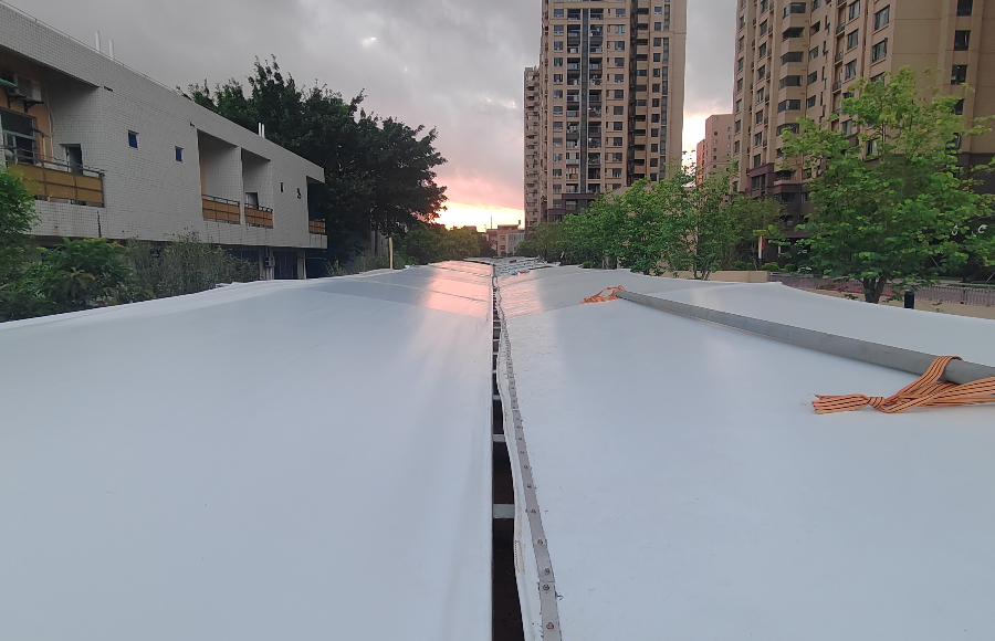 中山美荔新天地膜結(jié)構(gòu)停車棚工程正在施工,車棚設(shè)計為雙邊懸挑造型,目前工程進行膜材的覆蓋工作,不日將完工。