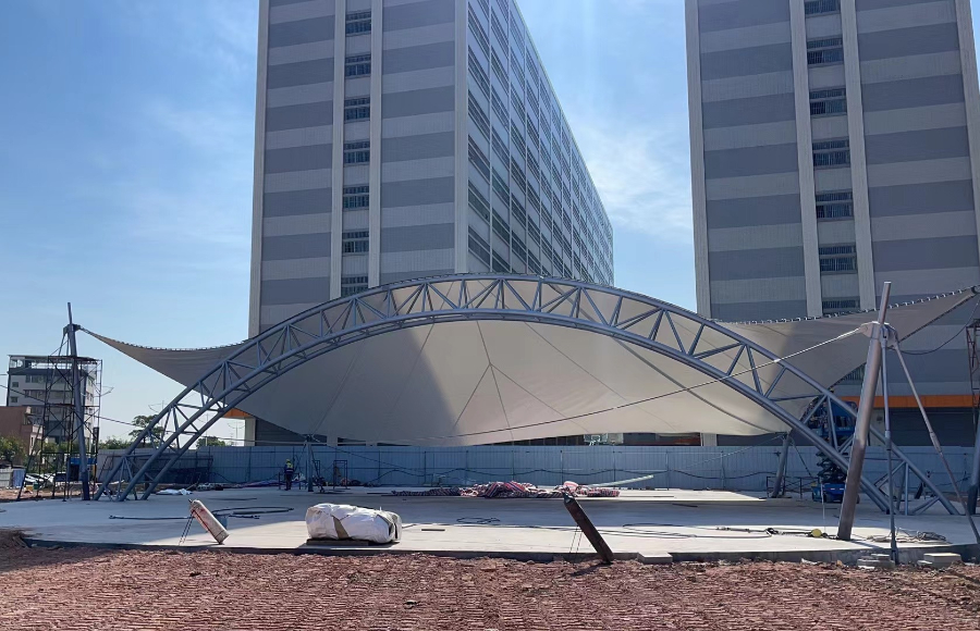 江門德昌電機(jī)膜結(jié)構(gòu)工程近日正在施工,目前已完成鋼結(jié)構(gòu)安裝,進(jìn)行膜材覆蓋工作,工程類型為膜結(jié)構(gòu)舞臺(tái)棚。
