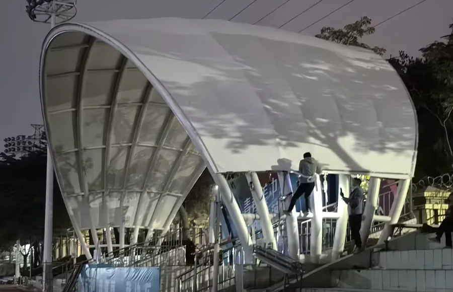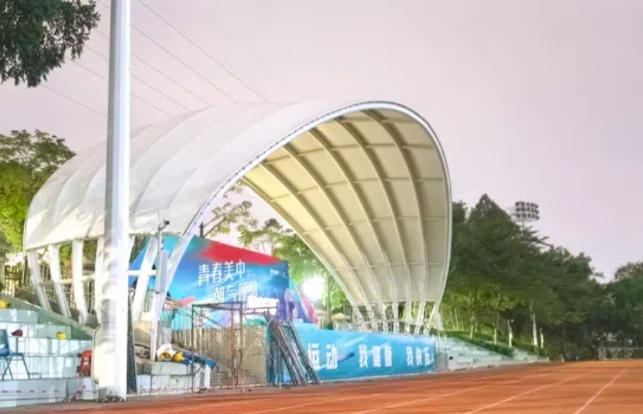深圳美中學(xué)校主席臺(tái)張拉膜結(jié)構(gòu)工程完工,主席臺(tái)設(shè)計(jì)為拱形,鋼骨架作為支撐結(jié)構(gòu),覆蓋白色膜材,在燈光的搭配下更加美觀。