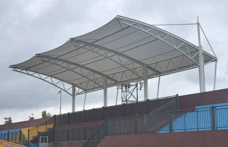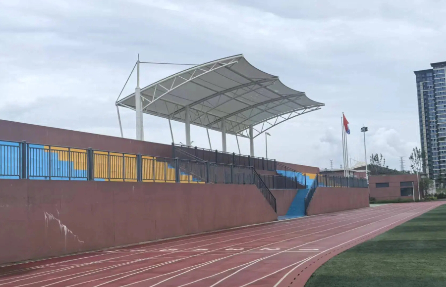 長沙翰林府明德智谷學校膜結構看臺工程近日基本完工,看臺設計為懸挑張拉結構。