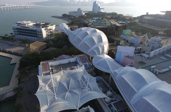 STFE 膜材的優(yōu)點:覆膜的清晰度較好,可實現(xiàn)一定程度的透景。同時,由于有織物基材提高了膜材強度,抗拉強度可達4000N/5cm。即使不加拉索,膜單元跨度一般在3m以上。