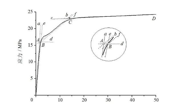 ETFE膜材在應(yīng)力不超過第一轉(zhuǎn)折點時可以認為是線彈性材料,第一轉(zhuǎn)折點和第二轉(zhuǎn)折點之間材料發(fā)生了屈服,兩個轉(zhuǎn)折點分別定義為ETFE膜材的第一屈服點和第二屈服點。圖中,B點即為第一轉(zhuǎn)折點,對應(yīng)的應(yīng)力為第一屈服強度;C點即為第二轉(zhuǎn)折點,對應(yīng)的應(yīng)力為第二屈服強度。