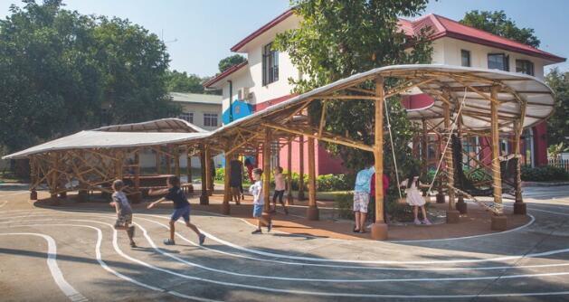 整個結(jié)構(gòu)由竹子和膜布建成,龍竹(Dendrocalamus giganteus )用于框架,銳藥竹(Oxytenanthera albocialiata Munro)用于弧形元素,而支撐和屋頂梁則采用泰竹(Thysostachys siamensis ), 屋頂覆蓋白色膜布,在∞形狀的兩個開口內(nèi)是場地的既有樹木和座位空間,供教師休息的同時能夠隨時視察孩子們的情況。